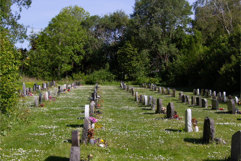 Gravplassen ligg på andre sida av vegen i høve til kyrkja. Det er ikkje minnelund på denne gravplassen.